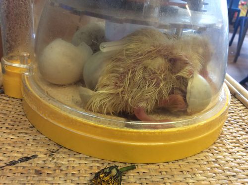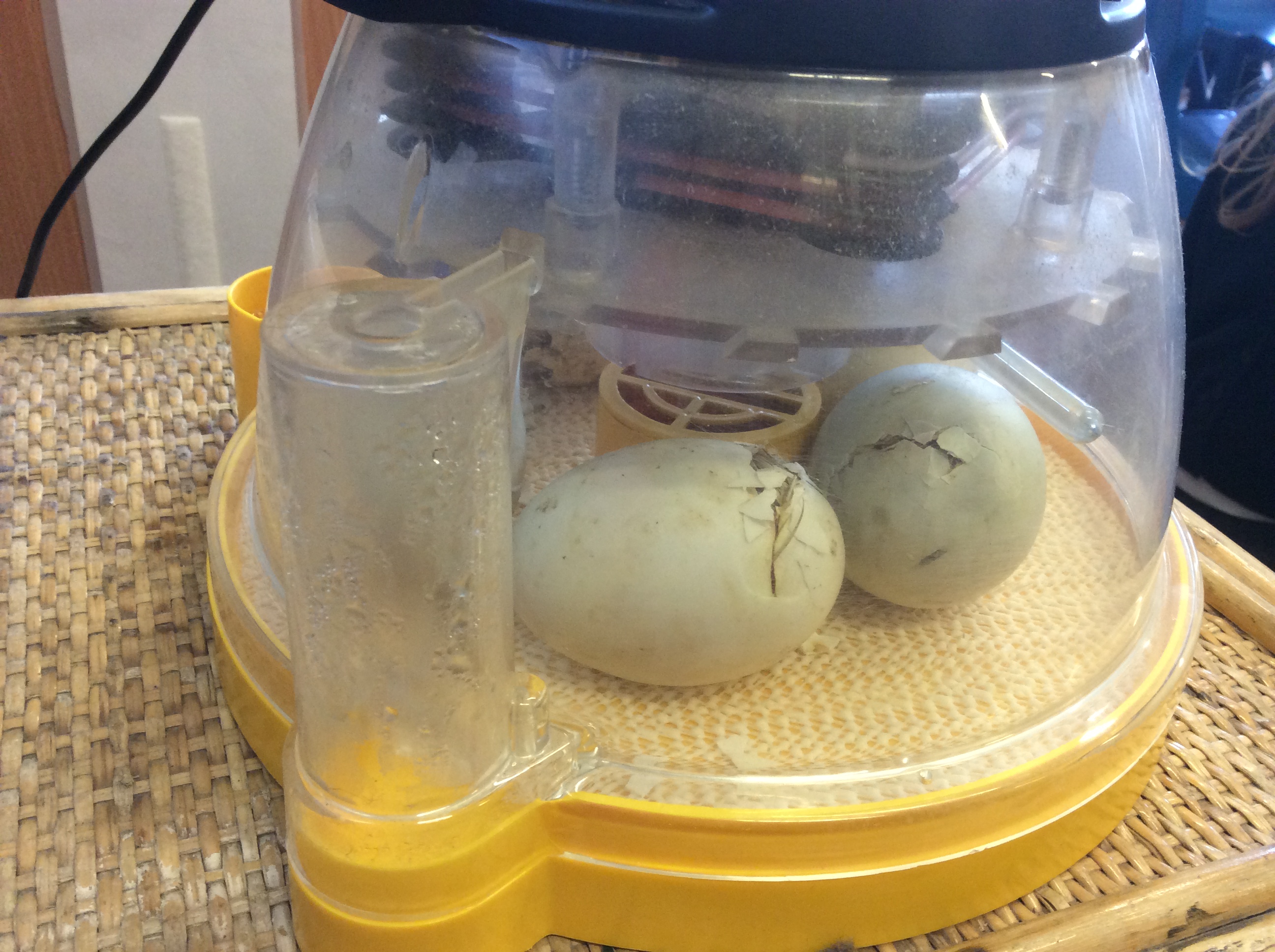 This morning we had our first hatchings! We couldn't believe how lucky were were when 2 ducklings hatched at the same time! They came out of the shell very tired and a bit wet. Once they are all fluffy and dry we will move them to their brooder box (cage) which has everything that they need.