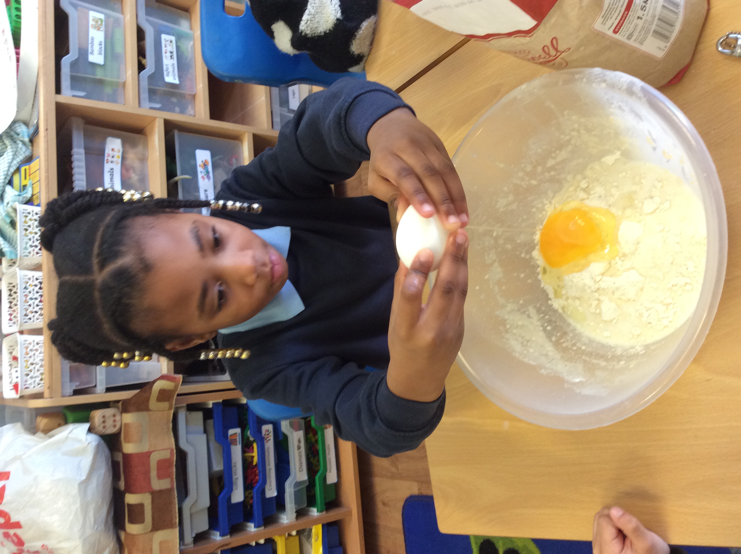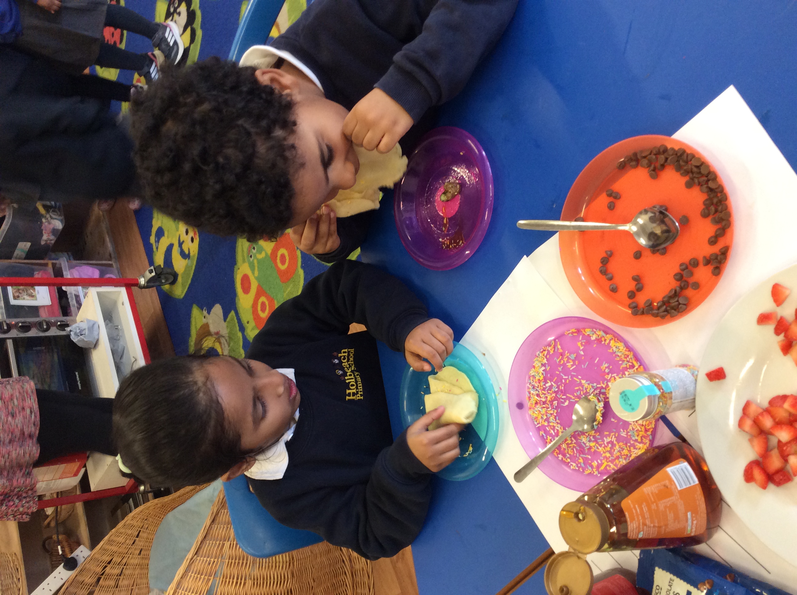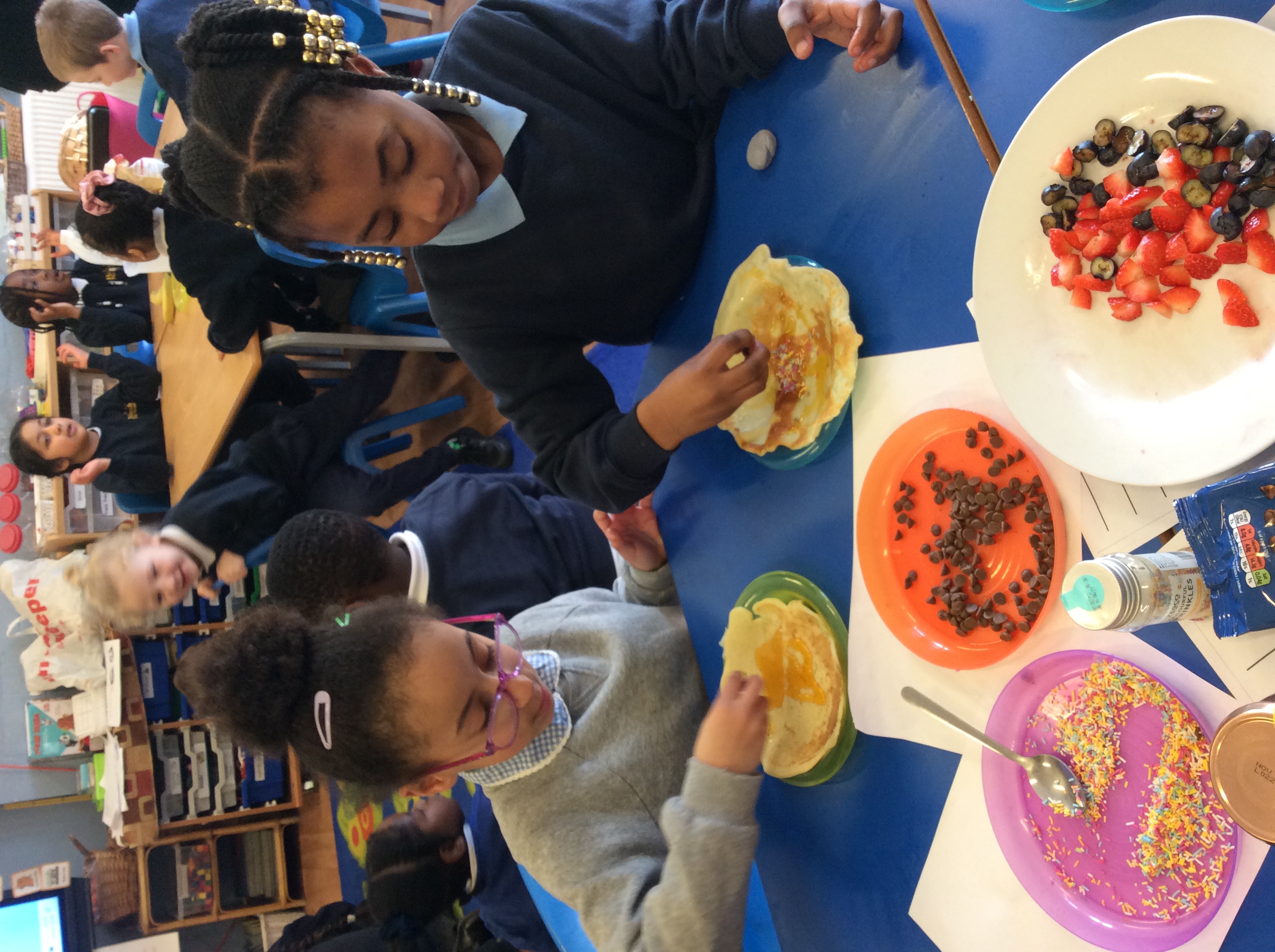 As our topic this term is 'Eggs let's get cracking' we have been looking at recipes that contain eggs. Yesterday, we made pancakes! We measured all the ingredients carefully to make a batter. Then an adult cooked the pancakes. We added toppings and enjoyed them!