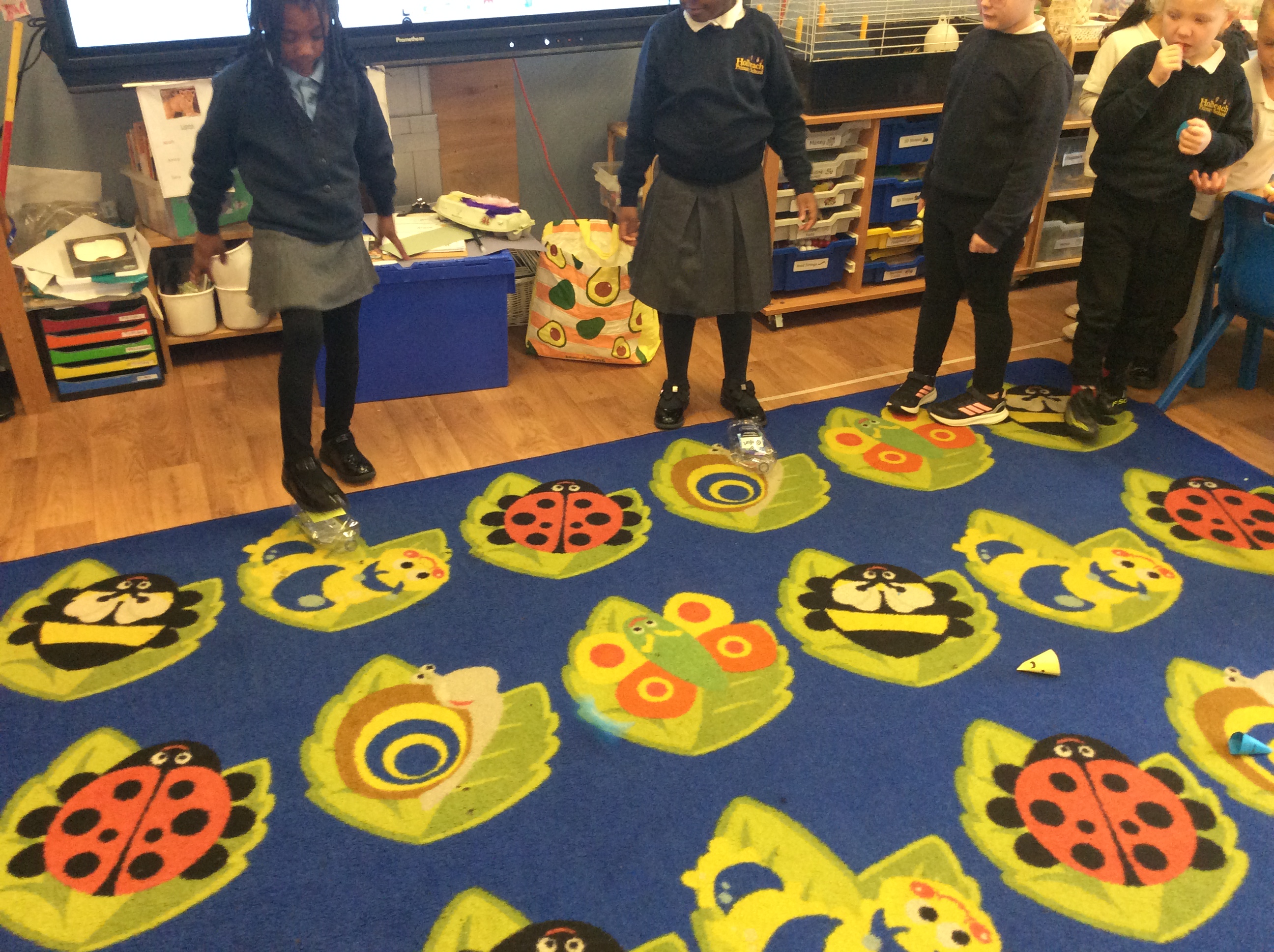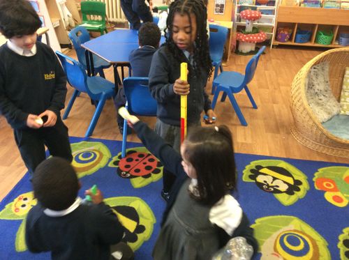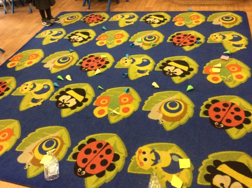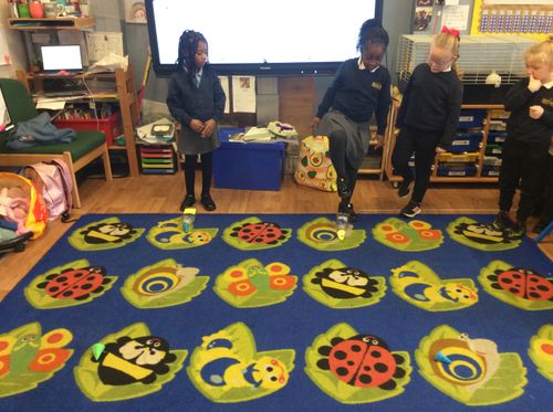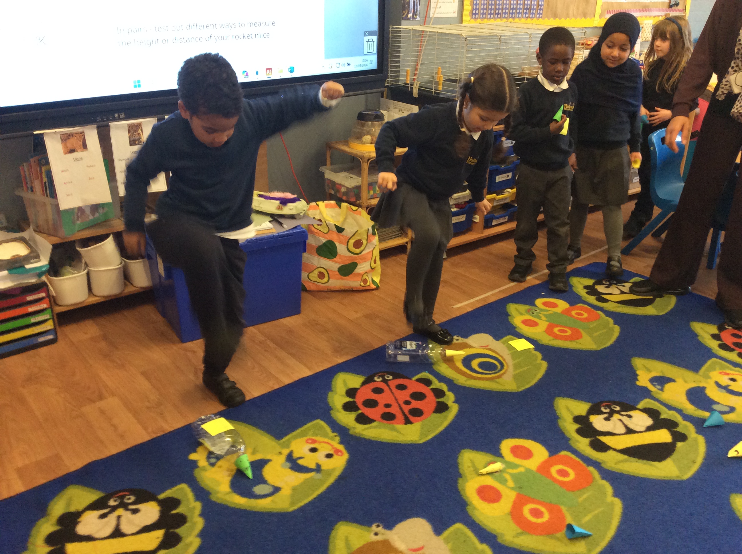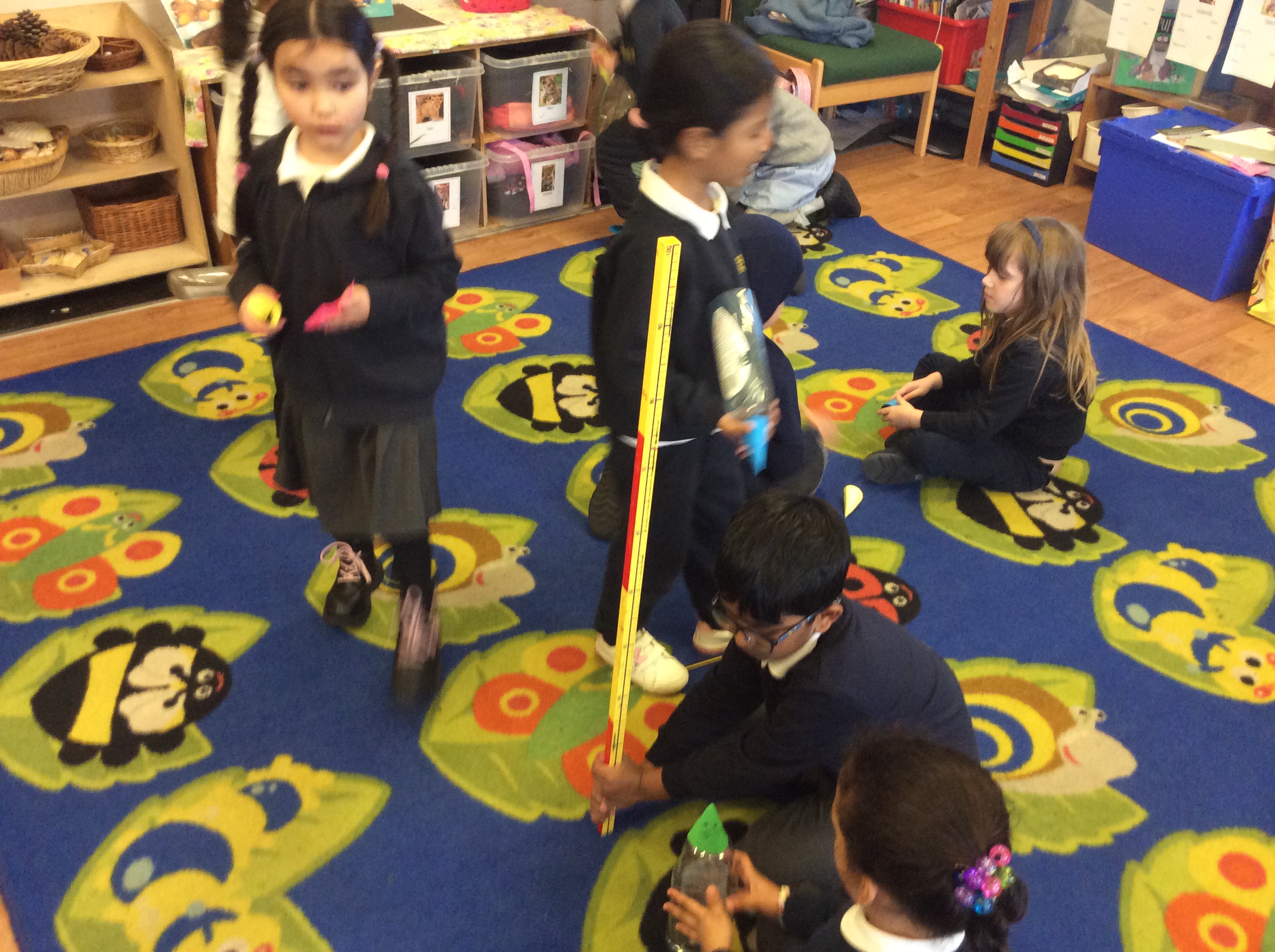 We then talked about how we could measure in different direction and measure along the floor. It was great fun stamping on the bottles to see how far the rocket mice would go. Amira got her rocket mouse all the way to the end of the carpet!