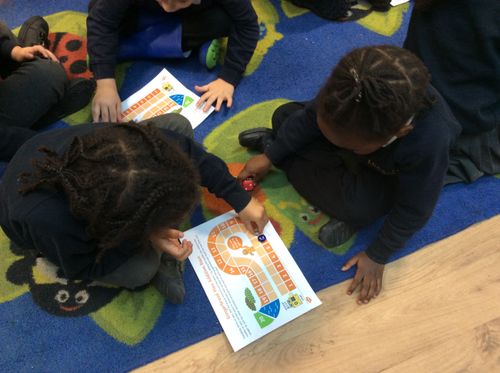 We have been playing number track games using dice and are getting really good at knowing the number shown on the dice and jumping that many spaces. They would love to play these at home, too!