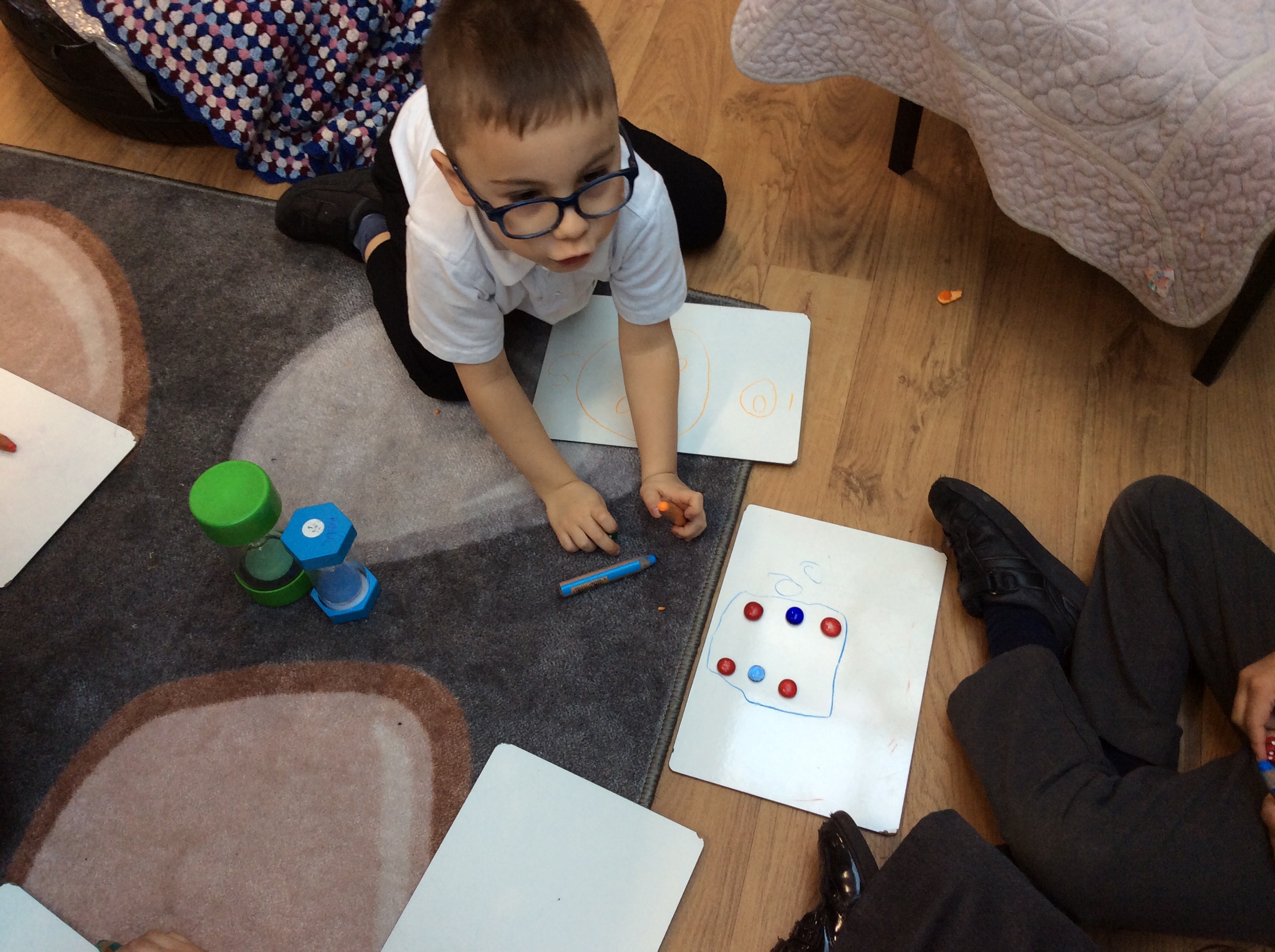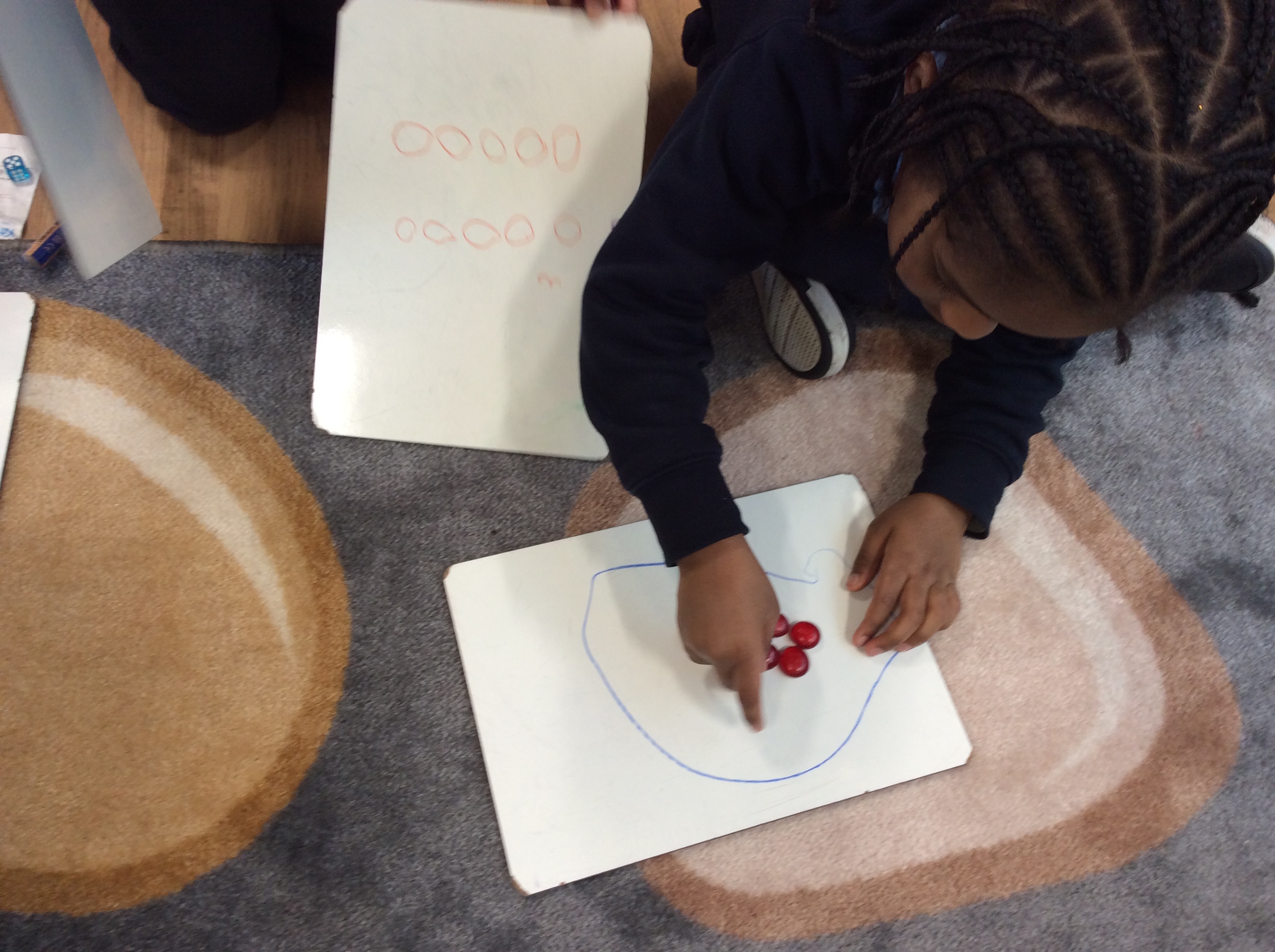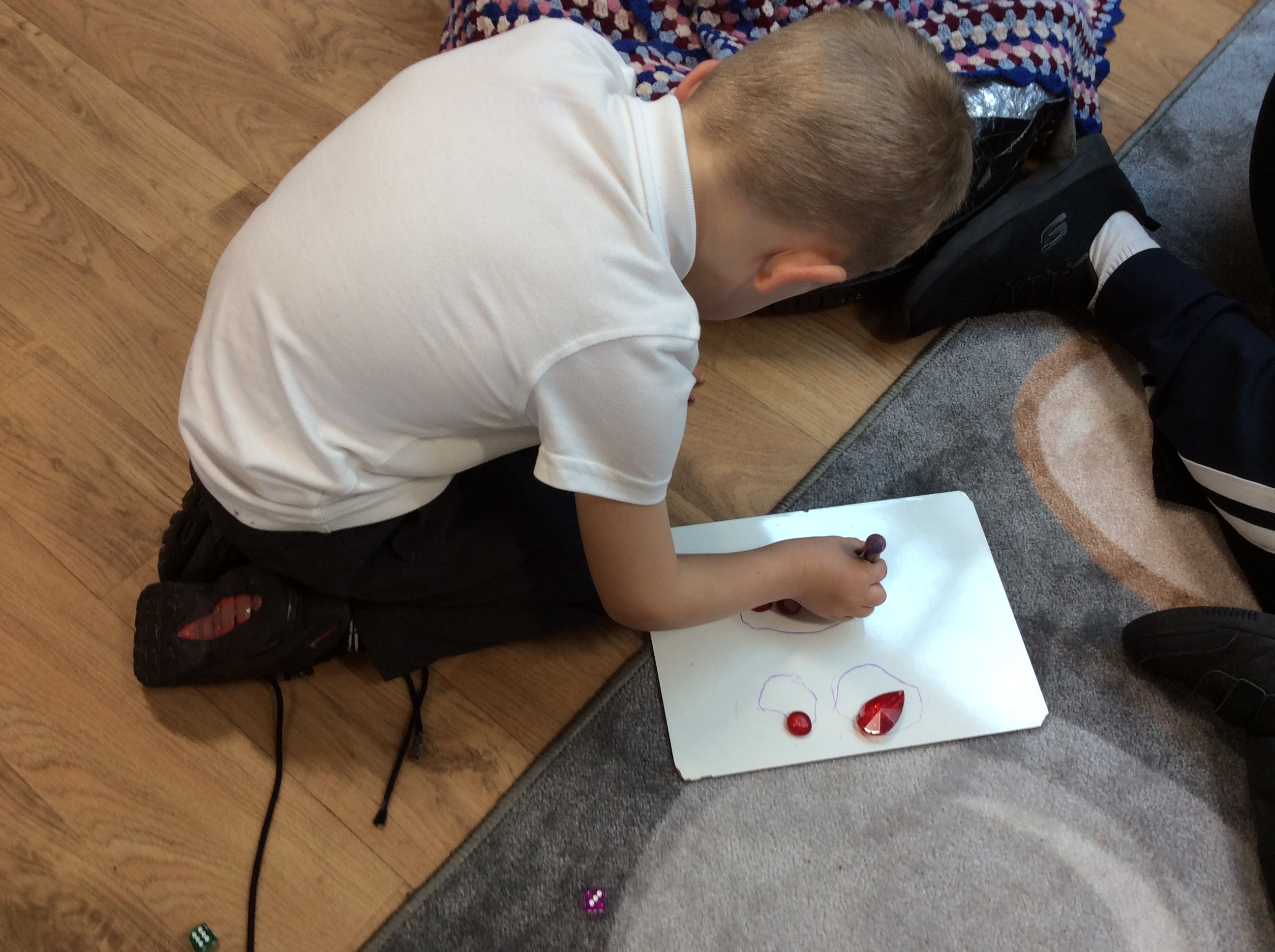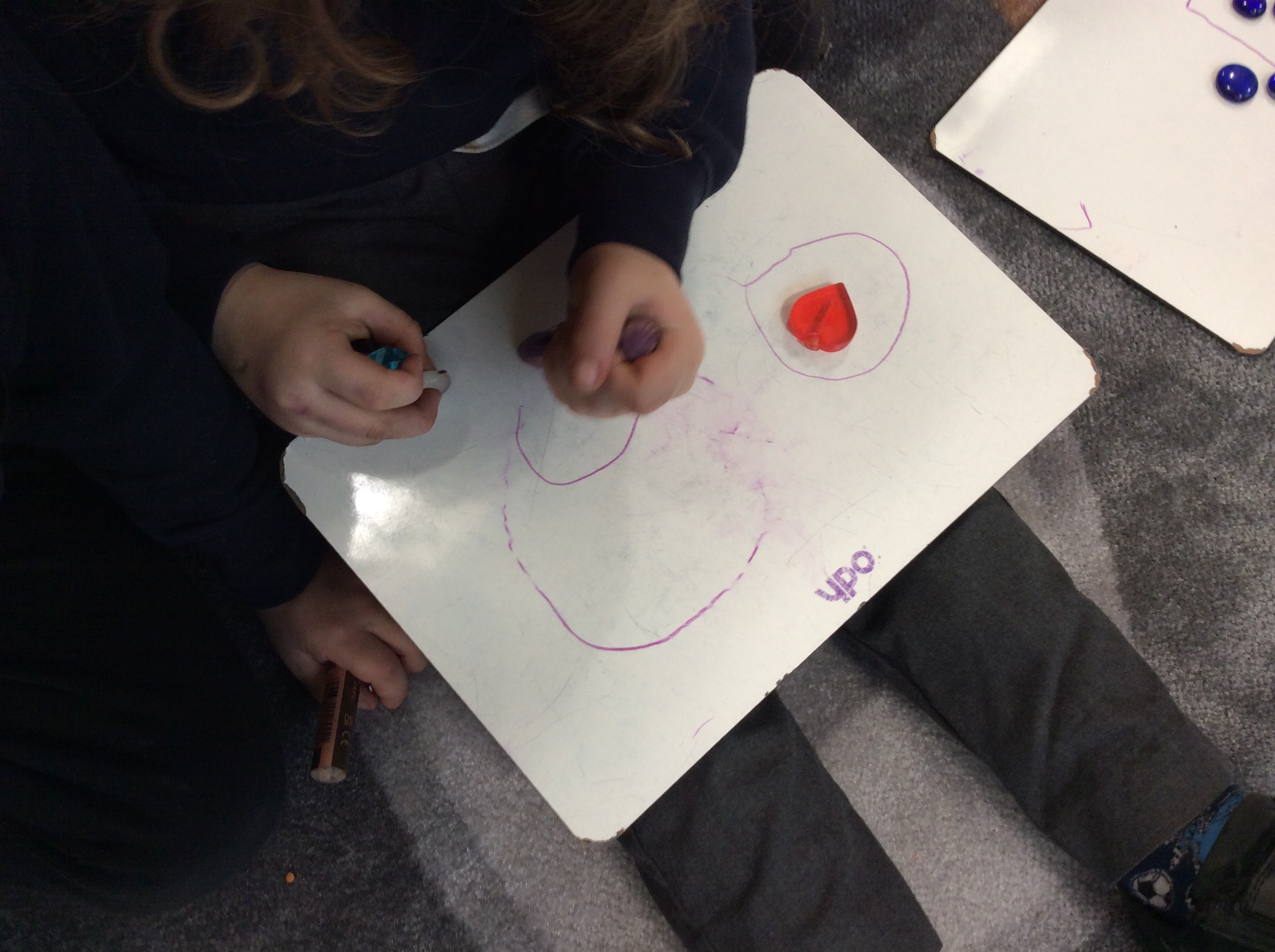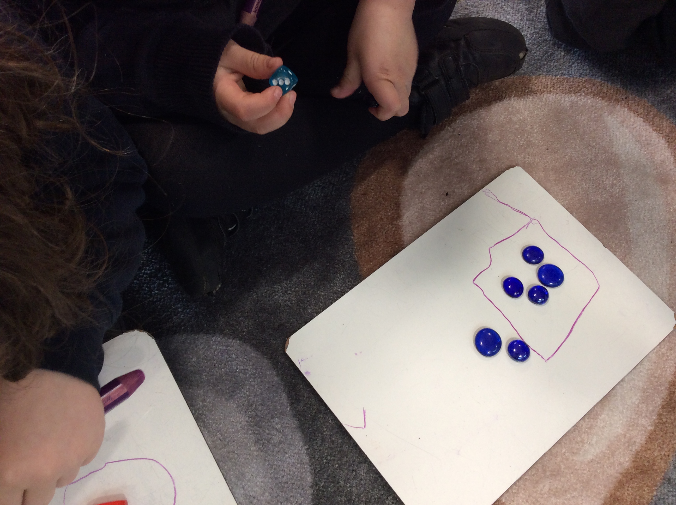 In Maths we rolled dice and collected that number of gems. We recorded the amounts in different ways on our whiteboards.