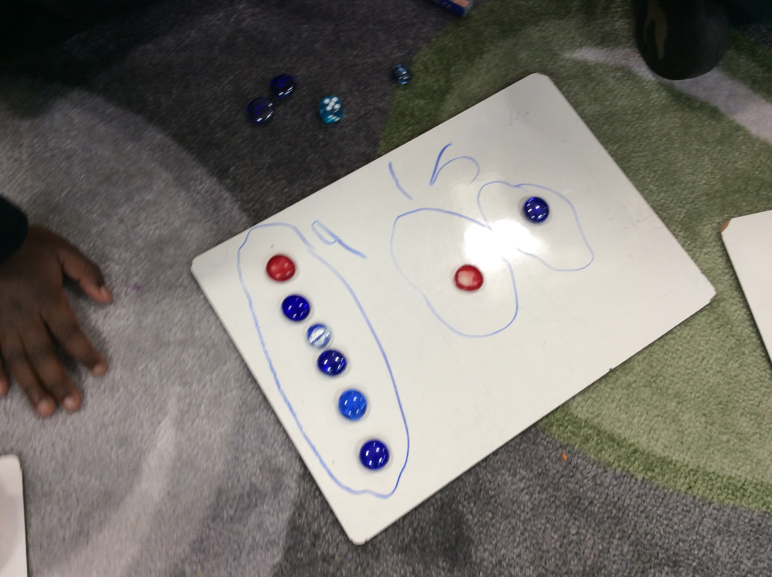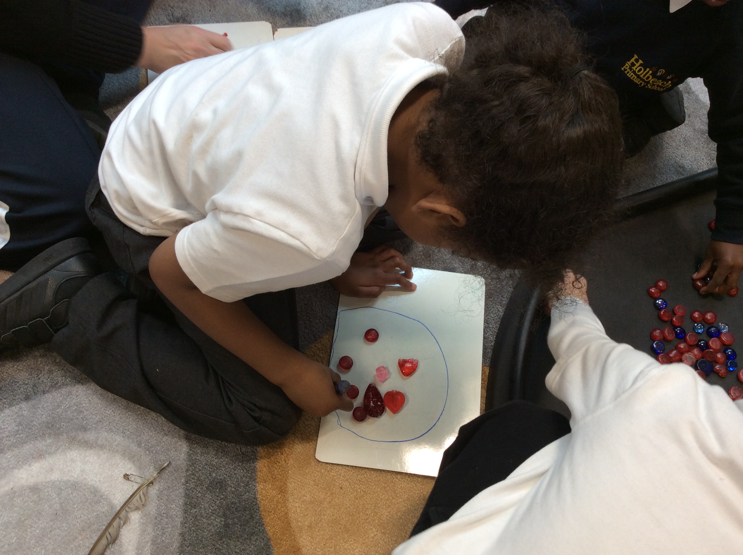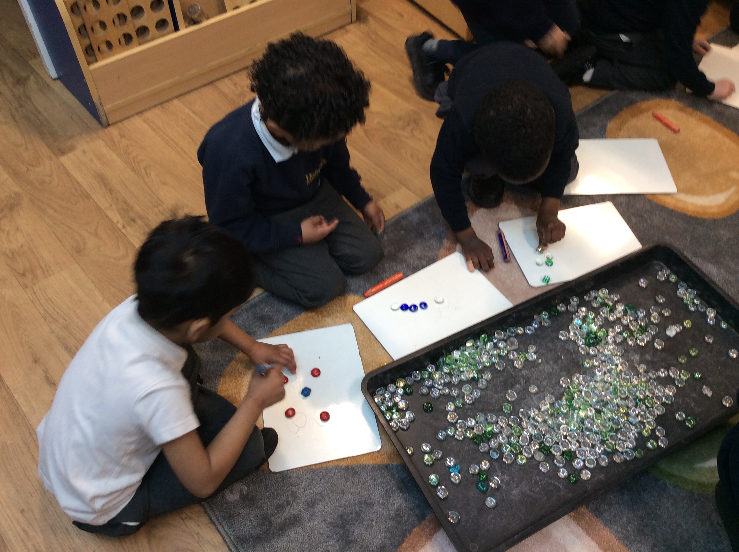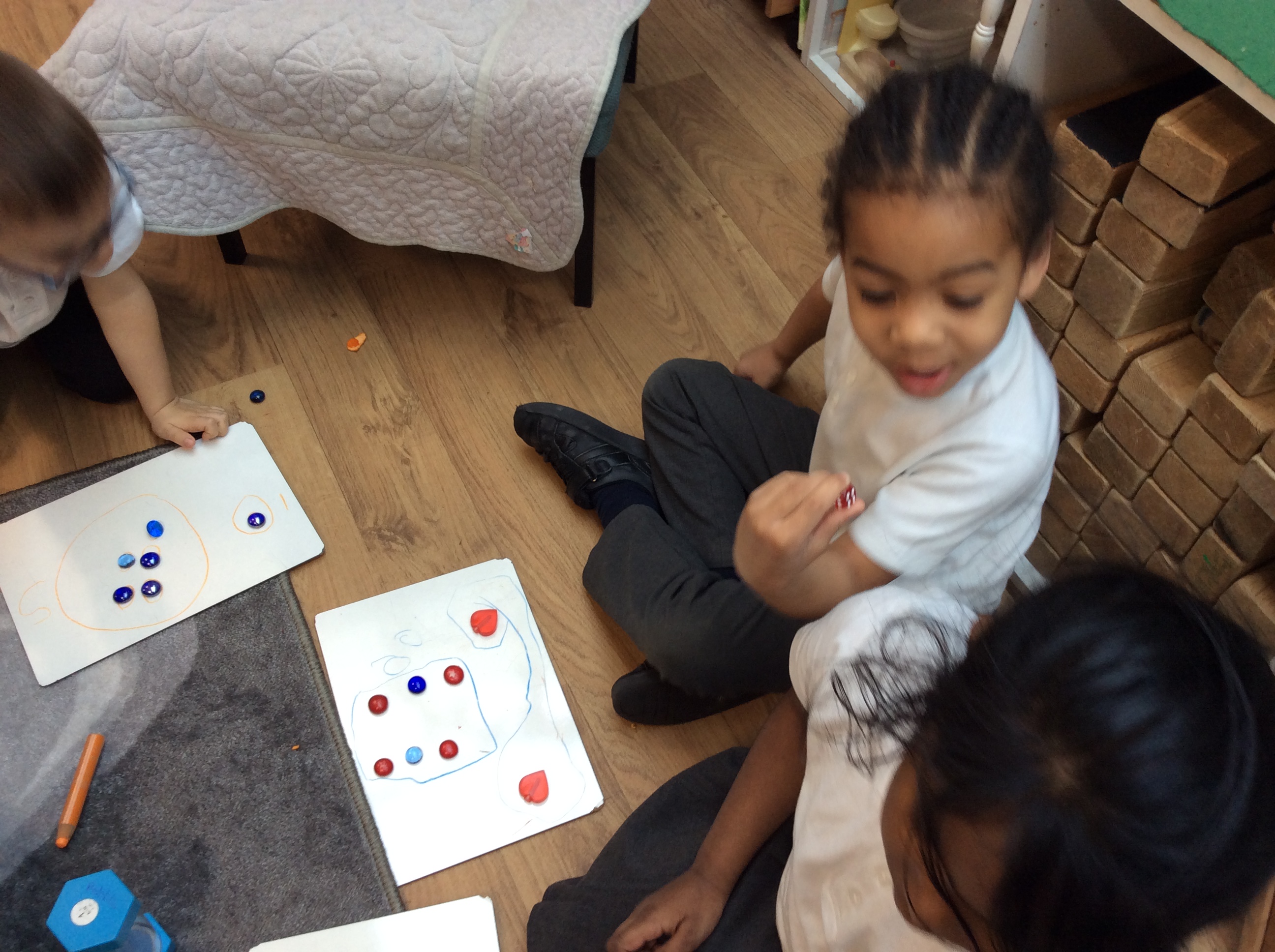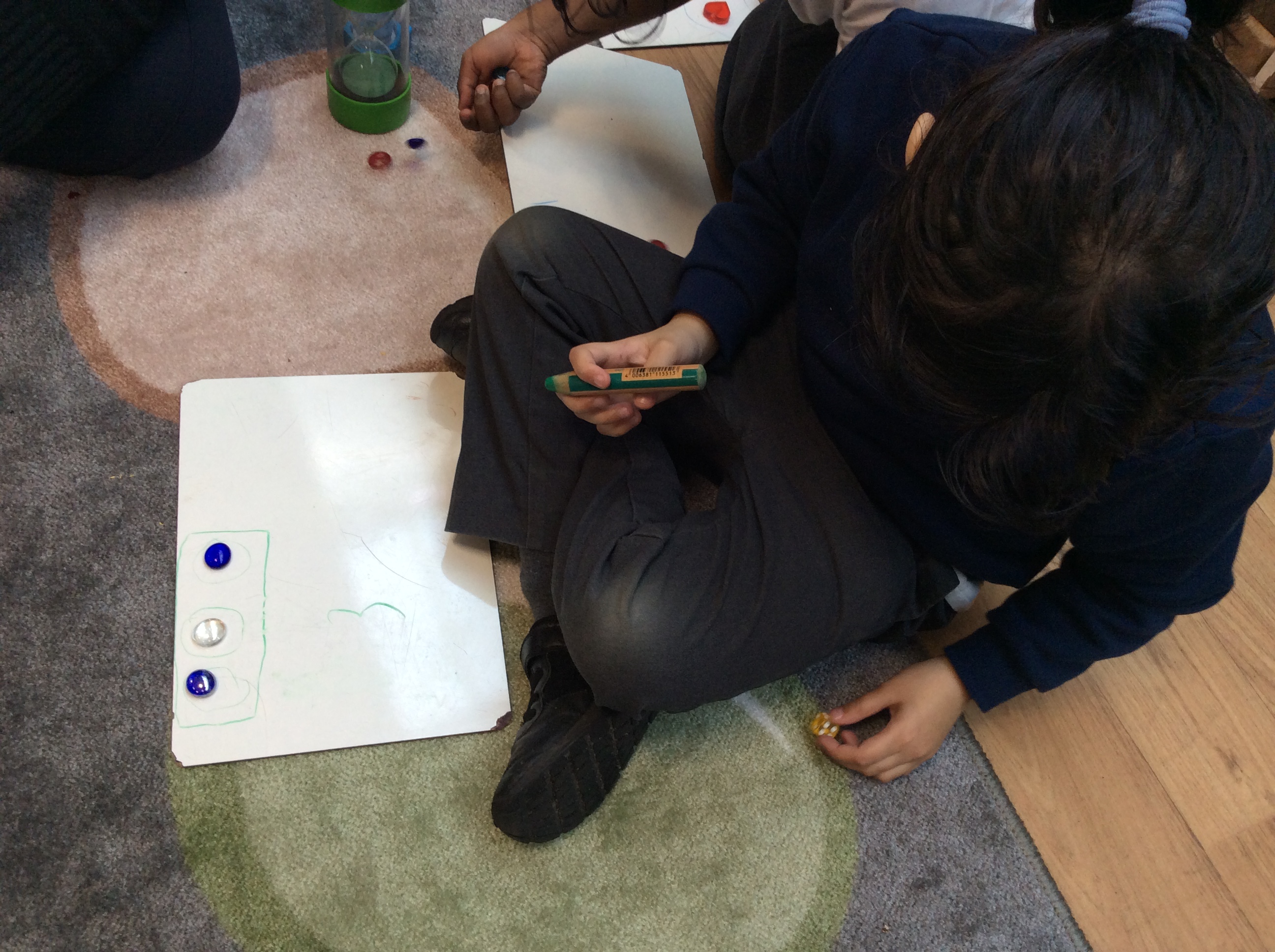 In Maths we rolled dice and collected that number of gems. We recorded the amounts in different ways on our whiteboards.