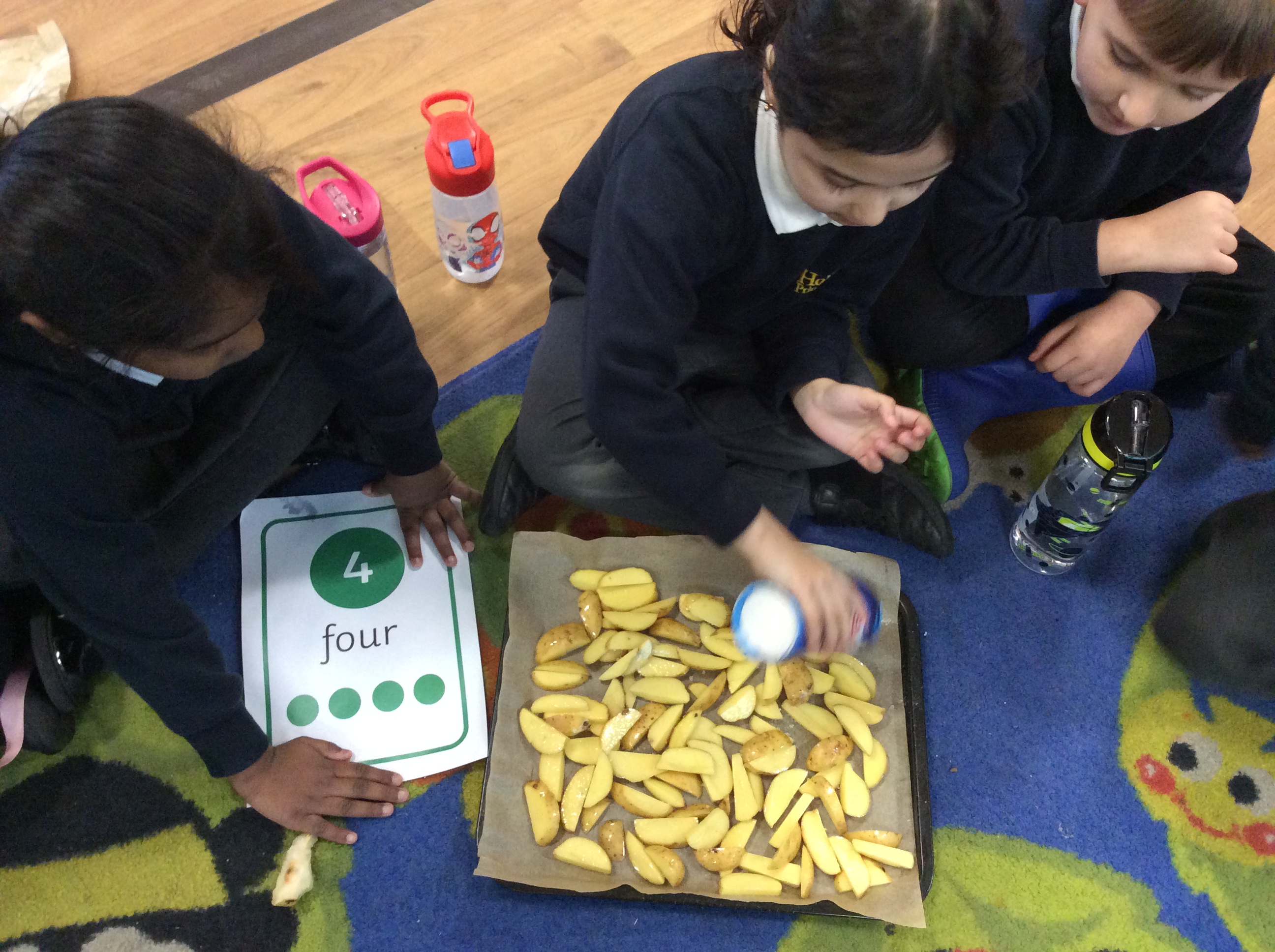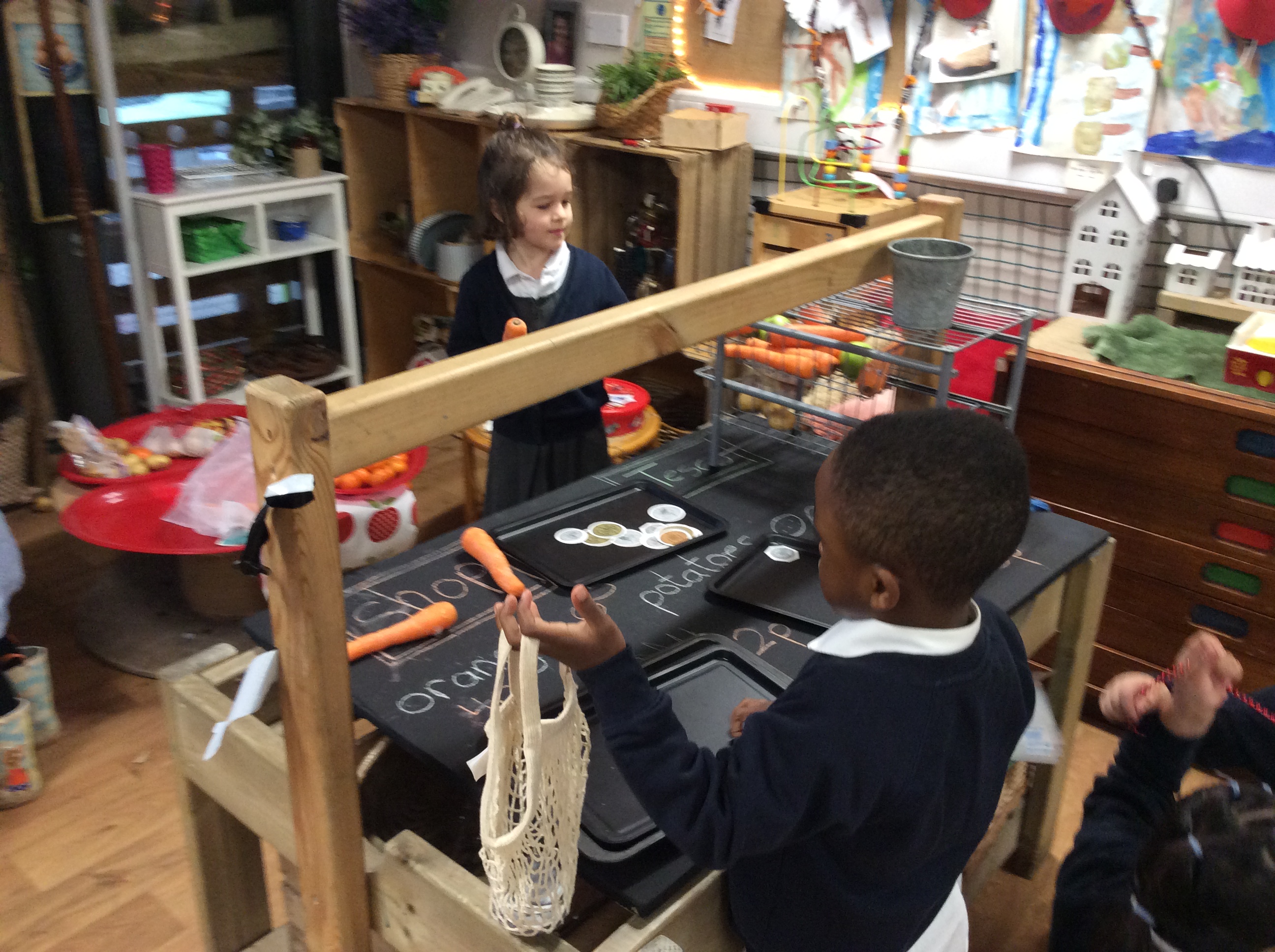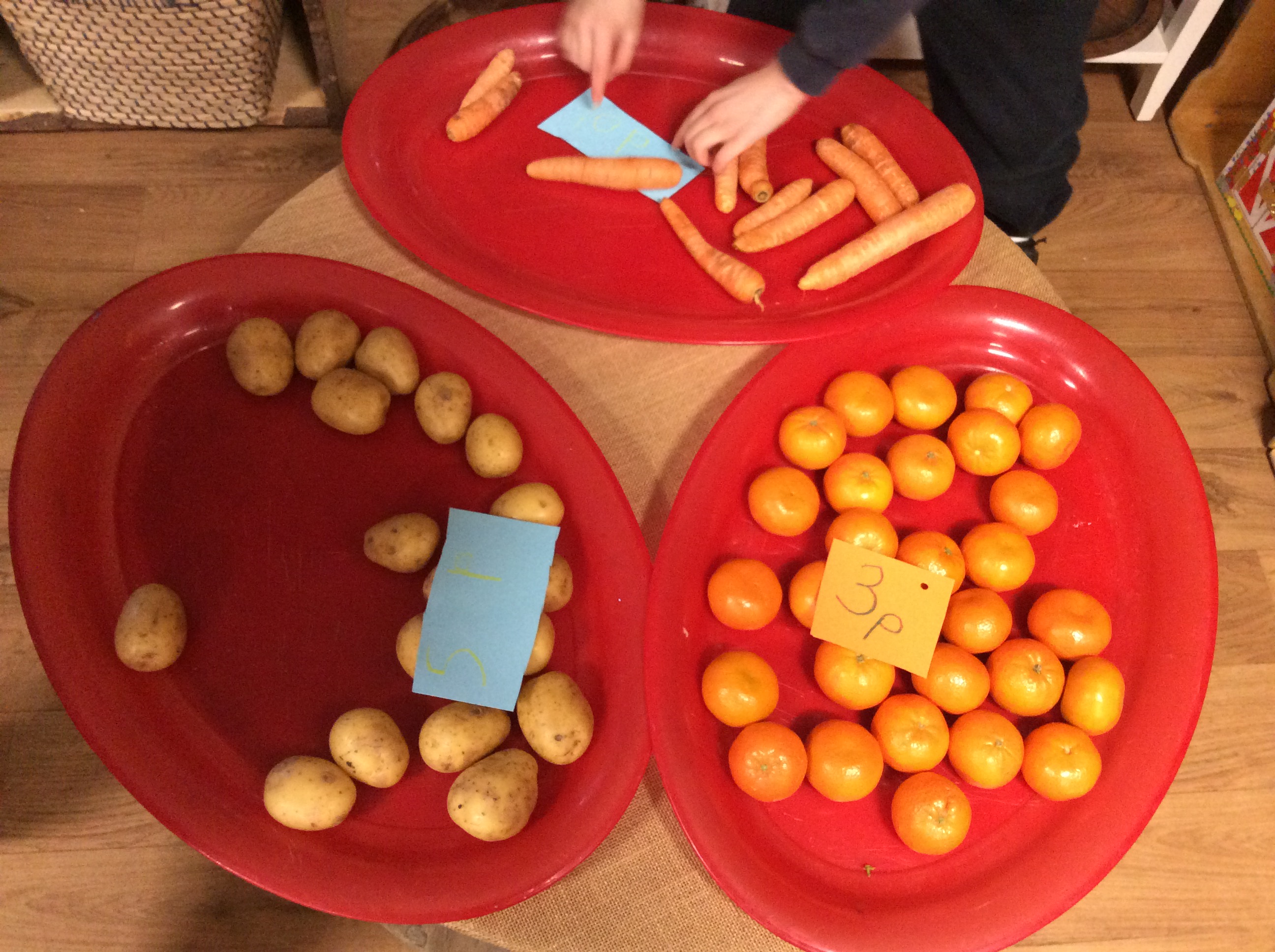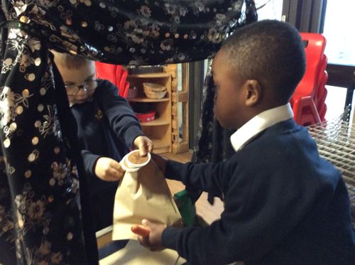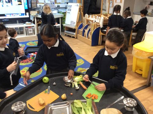 On Monday, Pebble Class made a fruit and vegetable shop in our role play area. We wrote shopping lists and counted out coins and vegetables. This was great for our Maths learning! Next, we chopped and grated. We made chips in our oven from the potatoes we bought. They were so yummy! We wrote the recipe in our books.
