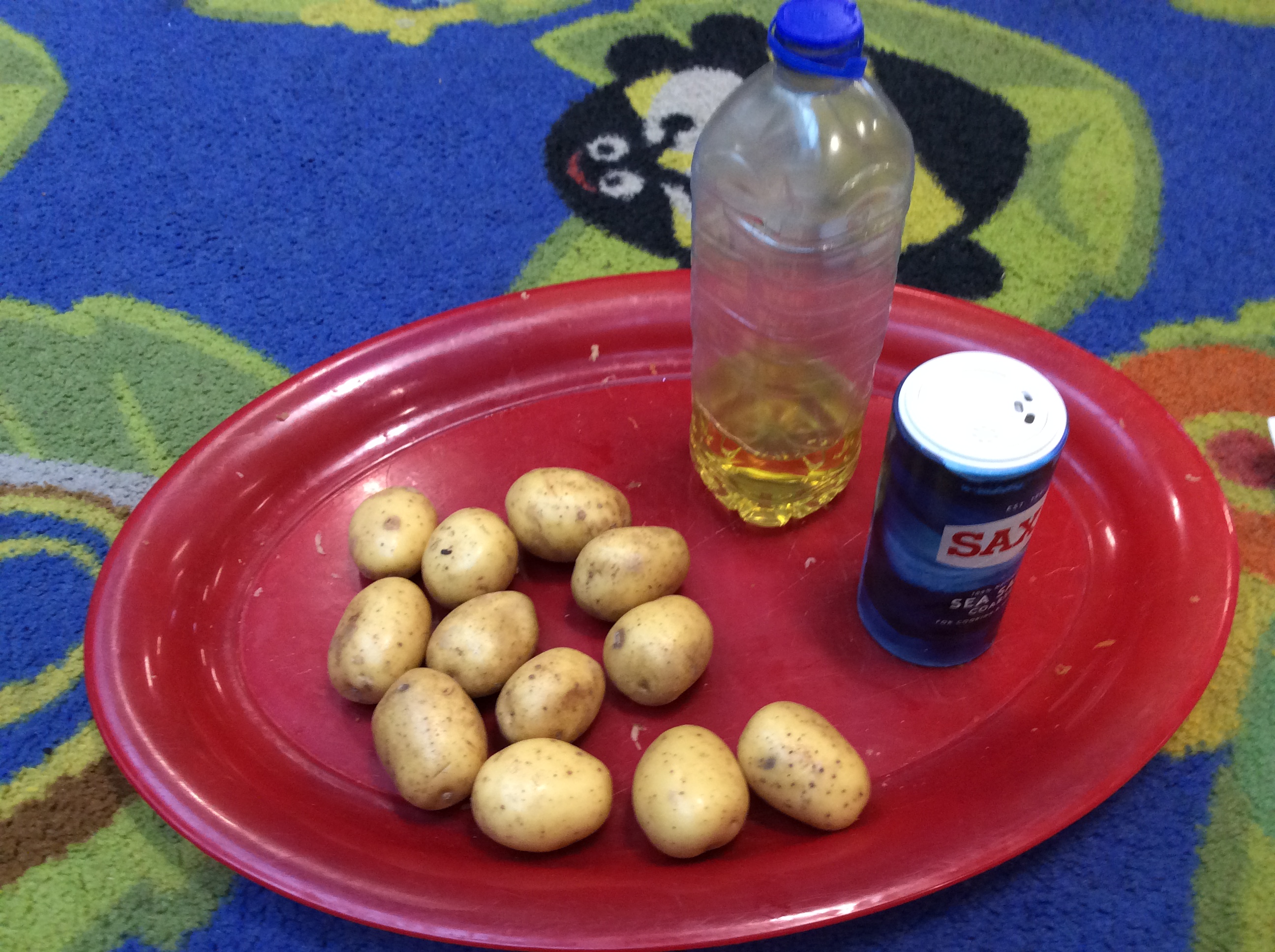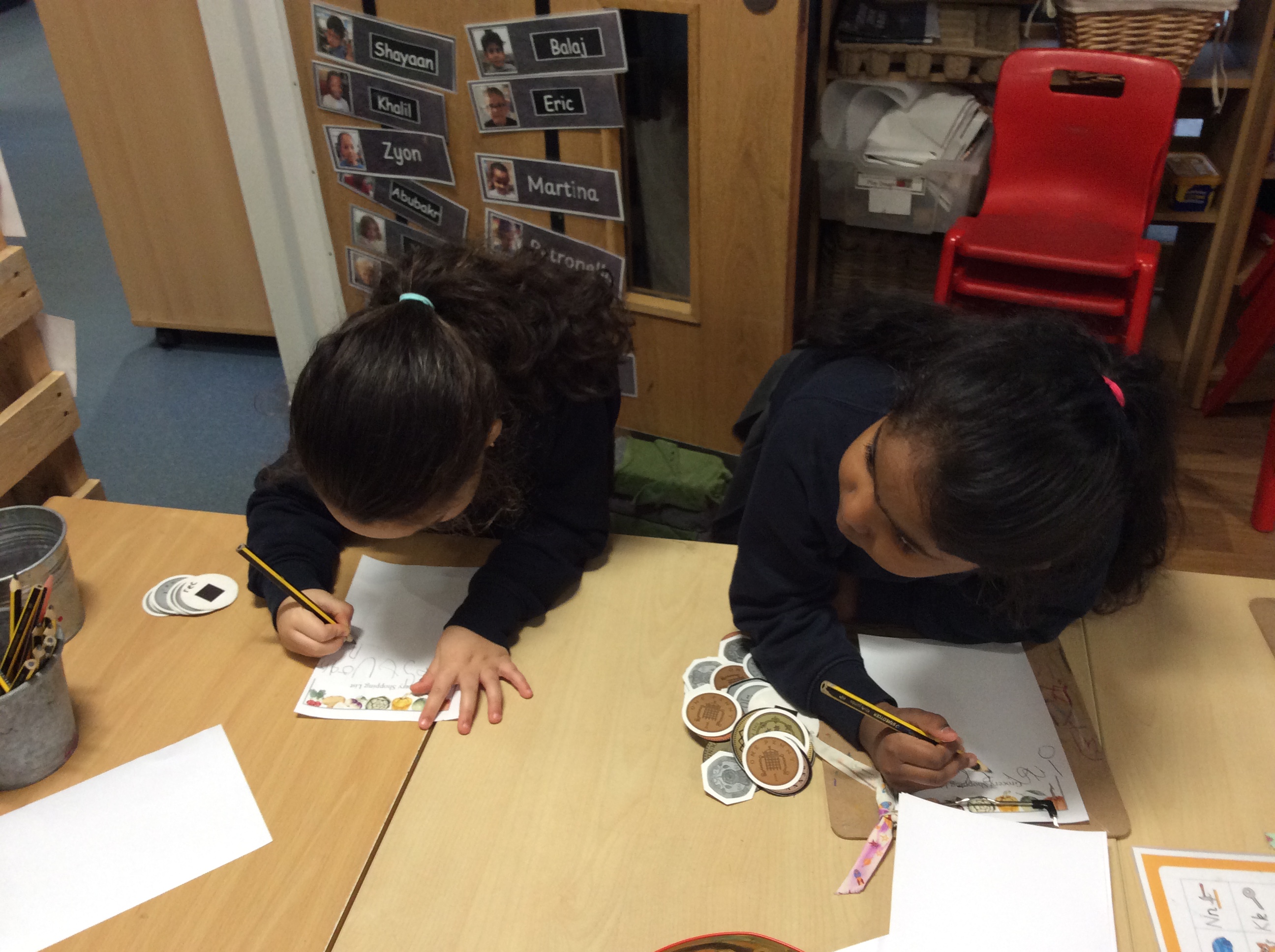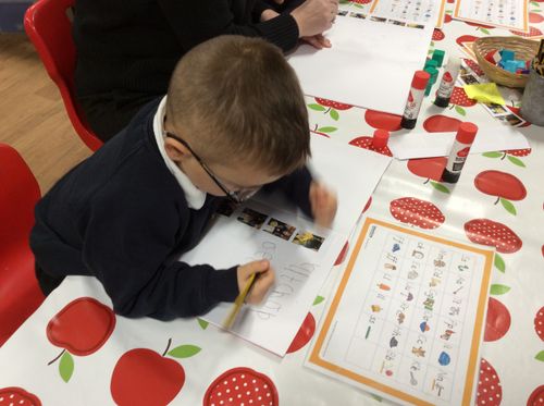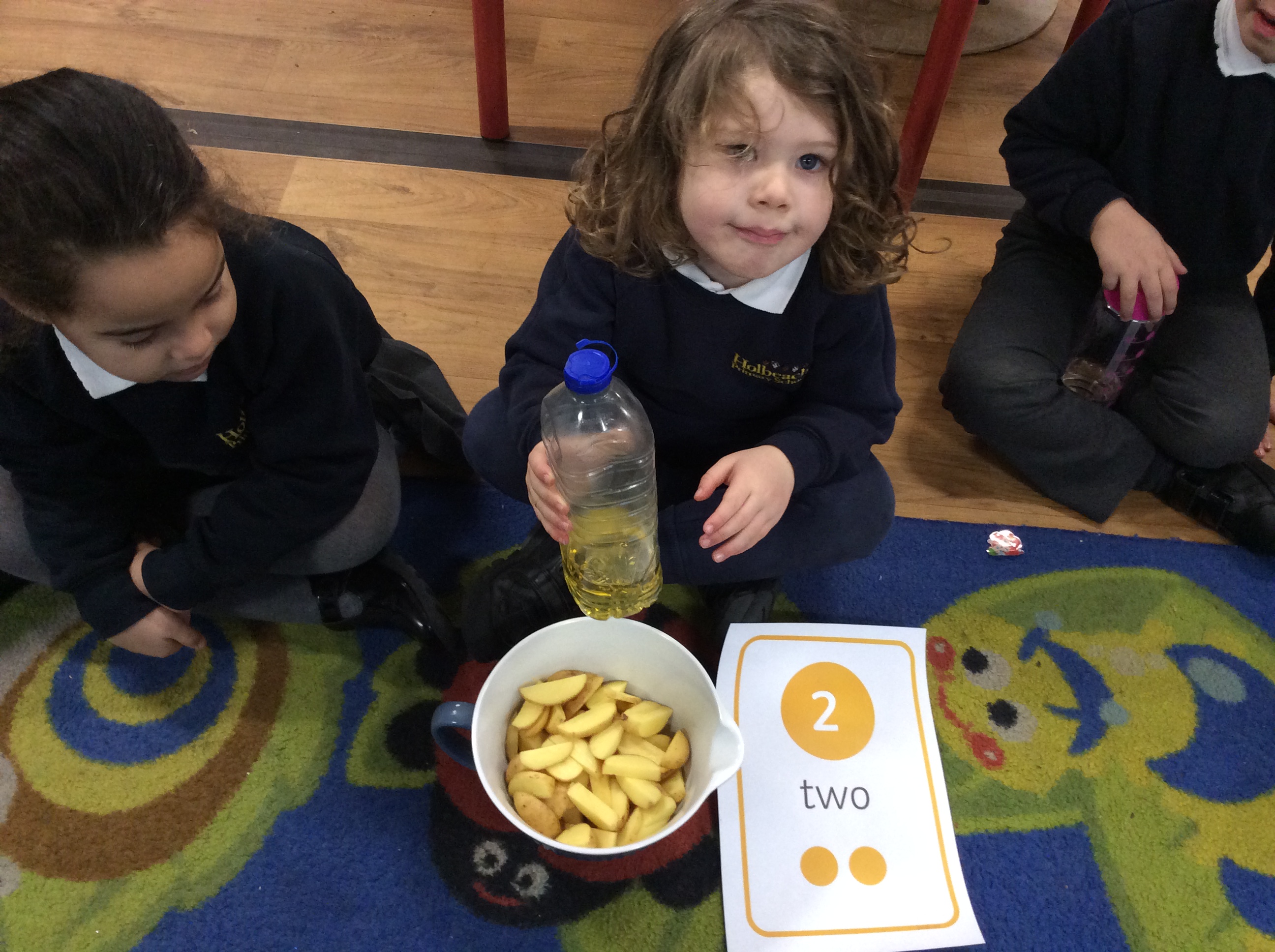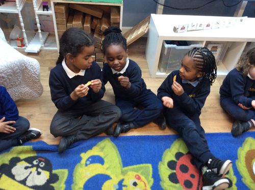 On Monday, Pebble Class made a fruit and vegetable shop in our role play area. We wrote shopping lists and counted out coins and vegetables. This was great for our Maths learning! Next, we chopped and grated. We made chips in our oven from the potatoes we bought. They were so yummy! We wrote the recipe in our books.