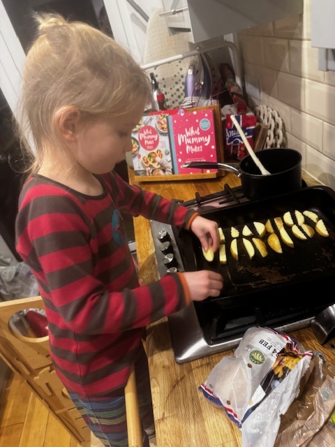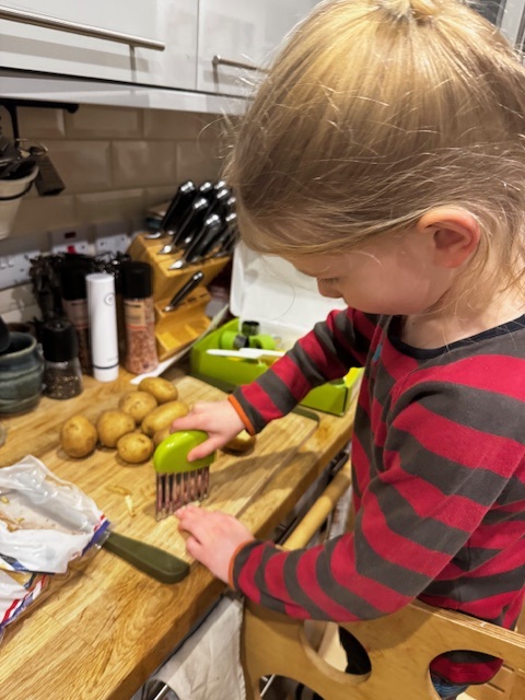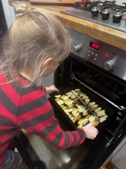 One of our friends in Pebble Class cooked chips at home following the recipe we made in class and brought them to school to share. We heated them in our oven and enjoyed them together. Please feel free to send in photos of your child cooking at home so we can celebrate this in class. The children are so proud to talk about their lives at home and what they like to do.